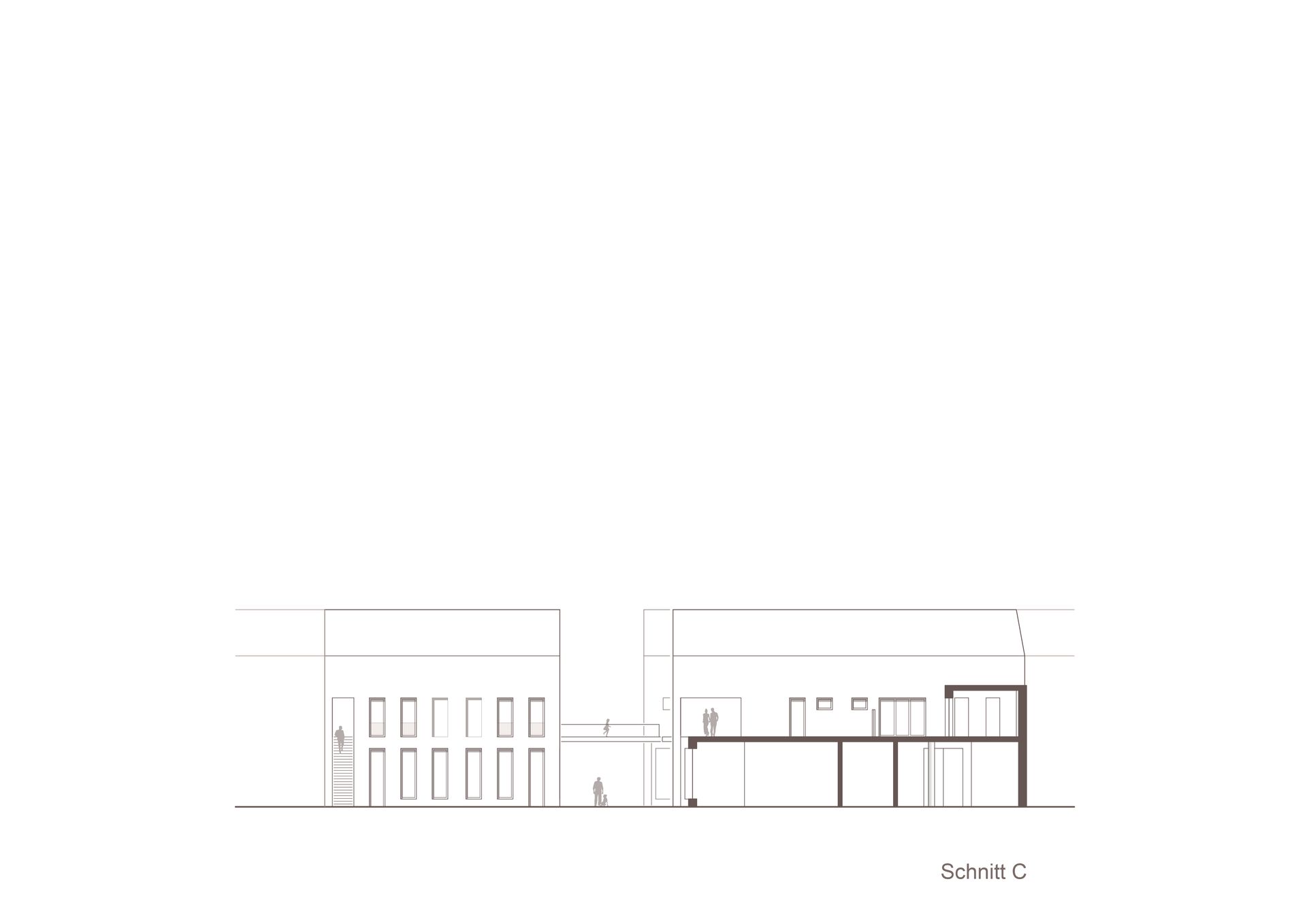 Die kleinen privaten Höfe sind an einen alten Häuserkomplex in der Bergstraße, direkt neben dem zu beplanenden Grundstück angelehnt. Dort gibt es ein Haus mit einem erhöhten Hof, beziehungsweise einem hochgelegten Atrium. Diese Idee wurde aufgegriffen und in den Entwurf integriert. Die Höfe, die jeweils südlich an den Wohnungen liegen, bilden zu dem einen Sichtschutz vor den Erschließungswegen der Nachbarn. Die Zeilen haben eine Distanz von nur 6,5m zueinander. Aus diesem Grunde sind die Dachgeschosse zum Norden hin bis auf Dachfenster komplett verschlossen, um Blicke in die Räumlichkeiten des Nachbarn zu verhindern. Zum Süden hingegen sind die Räume sehr offen.